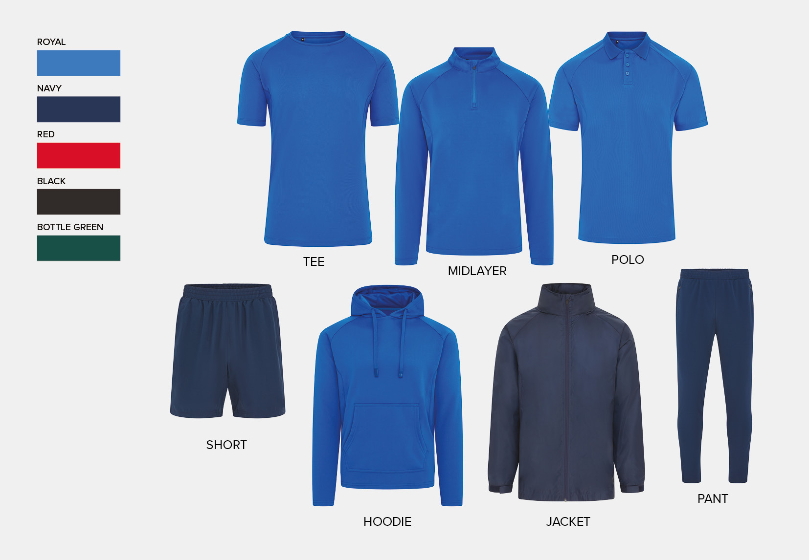 Range: Tee, Polo, Midlayer and Hoodie in Black, Navy, Red, Royal and Bottle Green. Shorts, Tech Pants and Lightweight Jacket in Black and Navy.