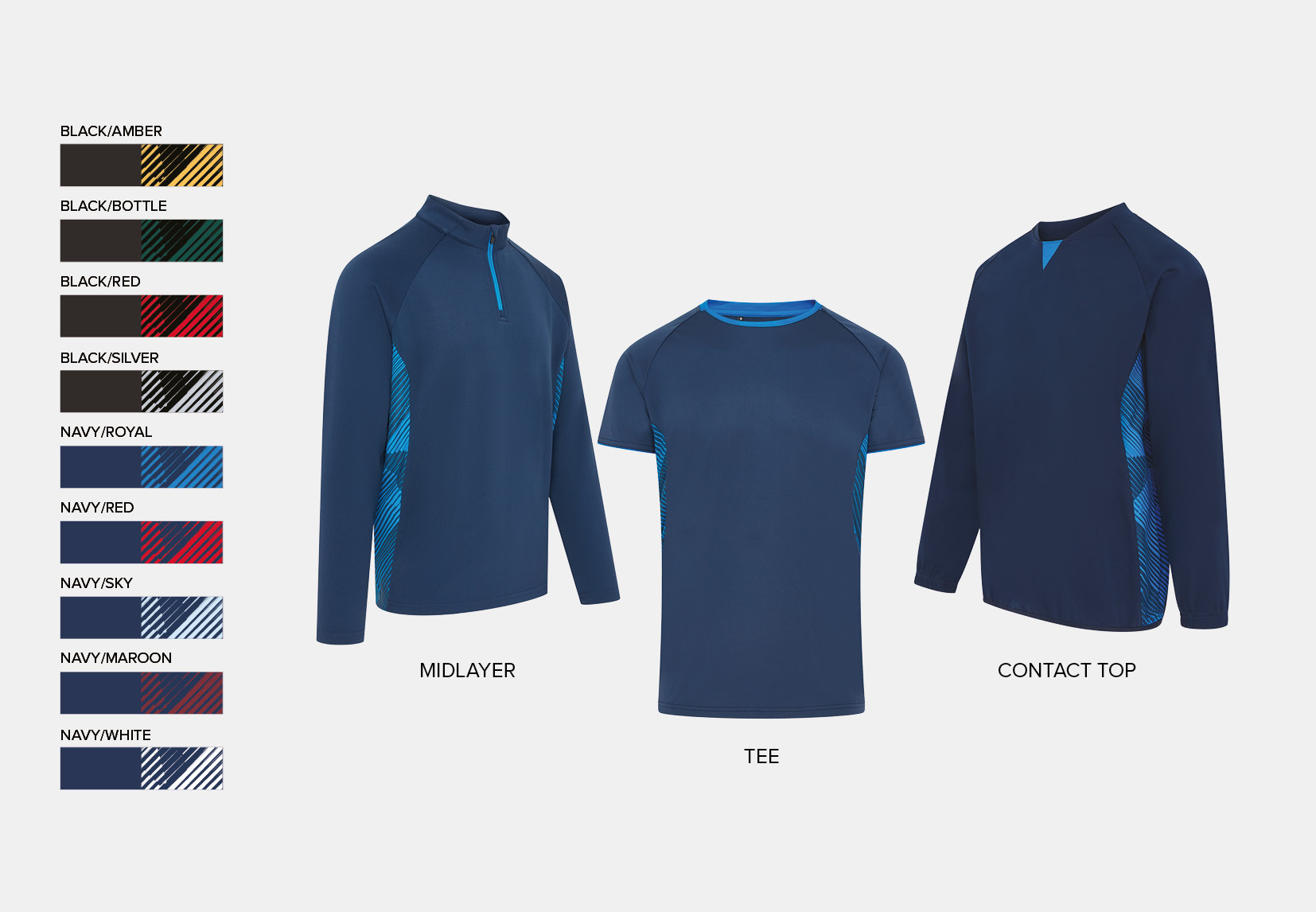 Range: Tee, Midlayer and Contact Top available in nine colour combinations.